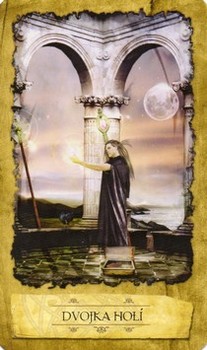 Mág drží hůl a přitom k sobě přivolává ještě druhou. Dvě hole a dva oblouky představují dva možné projekty nebo směry. Voda a měsíc v pravém oblouku jsou příslibem, že když budete věřit svým instinktům, rozhodnete se moudře.