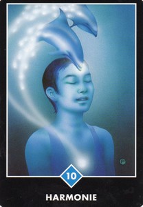 Tiché spočinutí v srdci v meditaci je zážitek, který nelze ani uchopit, ani vynutit. Přichází sám od sebe s tím, jak rosteme, stále více naladěni na rytmus našeho vlastního ticha. Postava na této kartě odráží sladkost a jemnost tohoto zážitku. Delfíni, kteří vyskakují ze srdce a obloukem se vracejí k třetímu oku, symbolizují hravost a inteligenci, která přichází, když se dokážeme spojit se svým srdcem a vyjít z něj do světa.